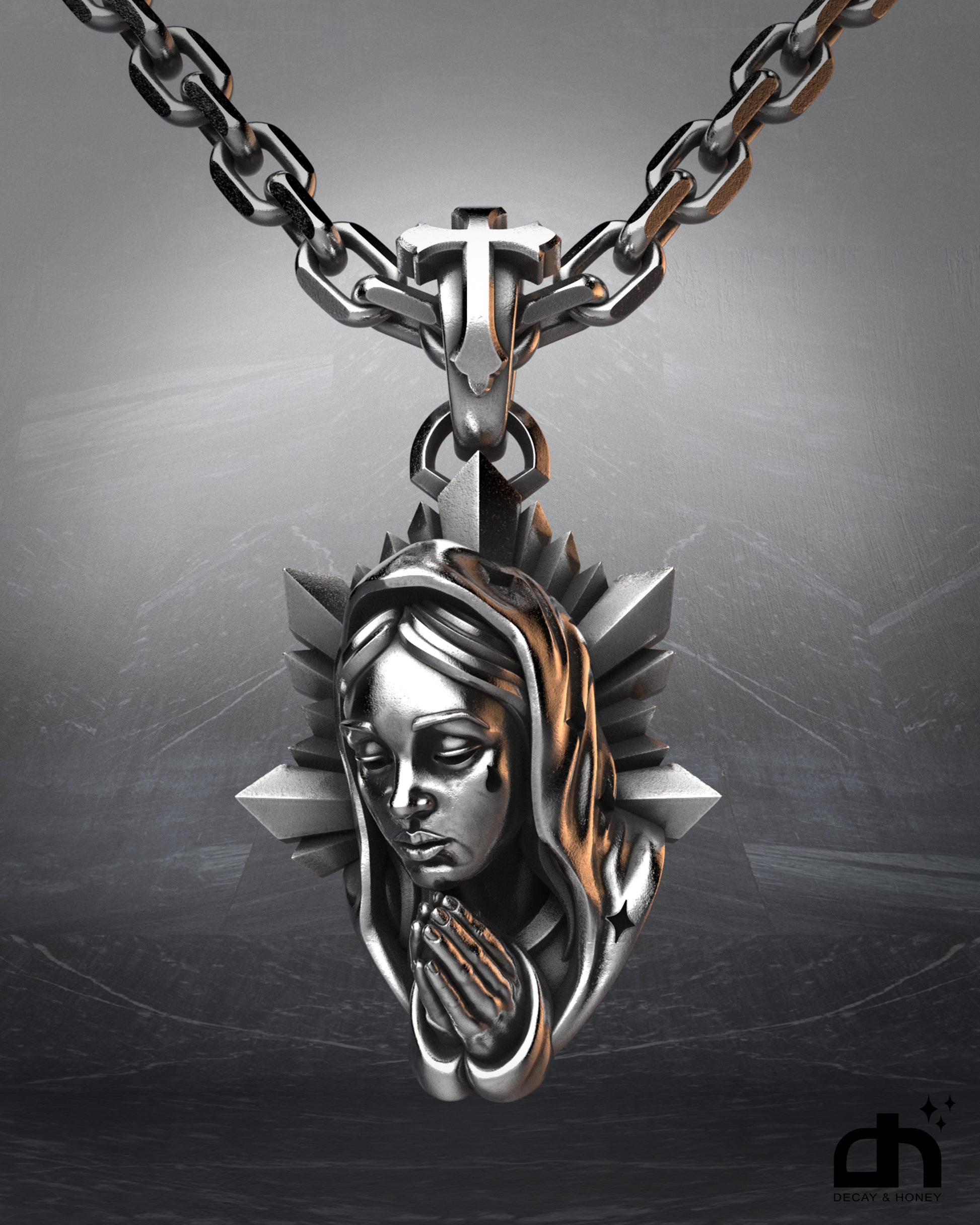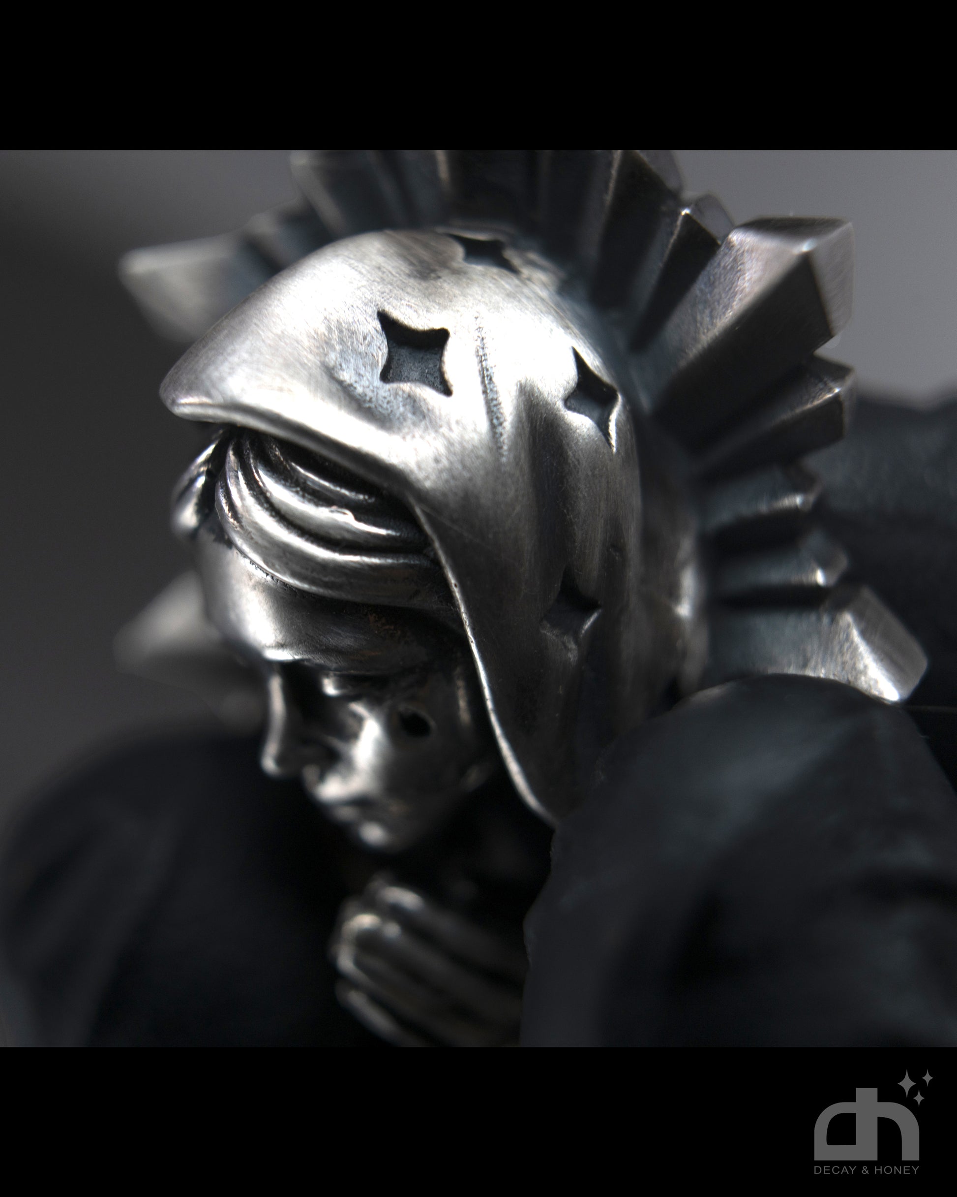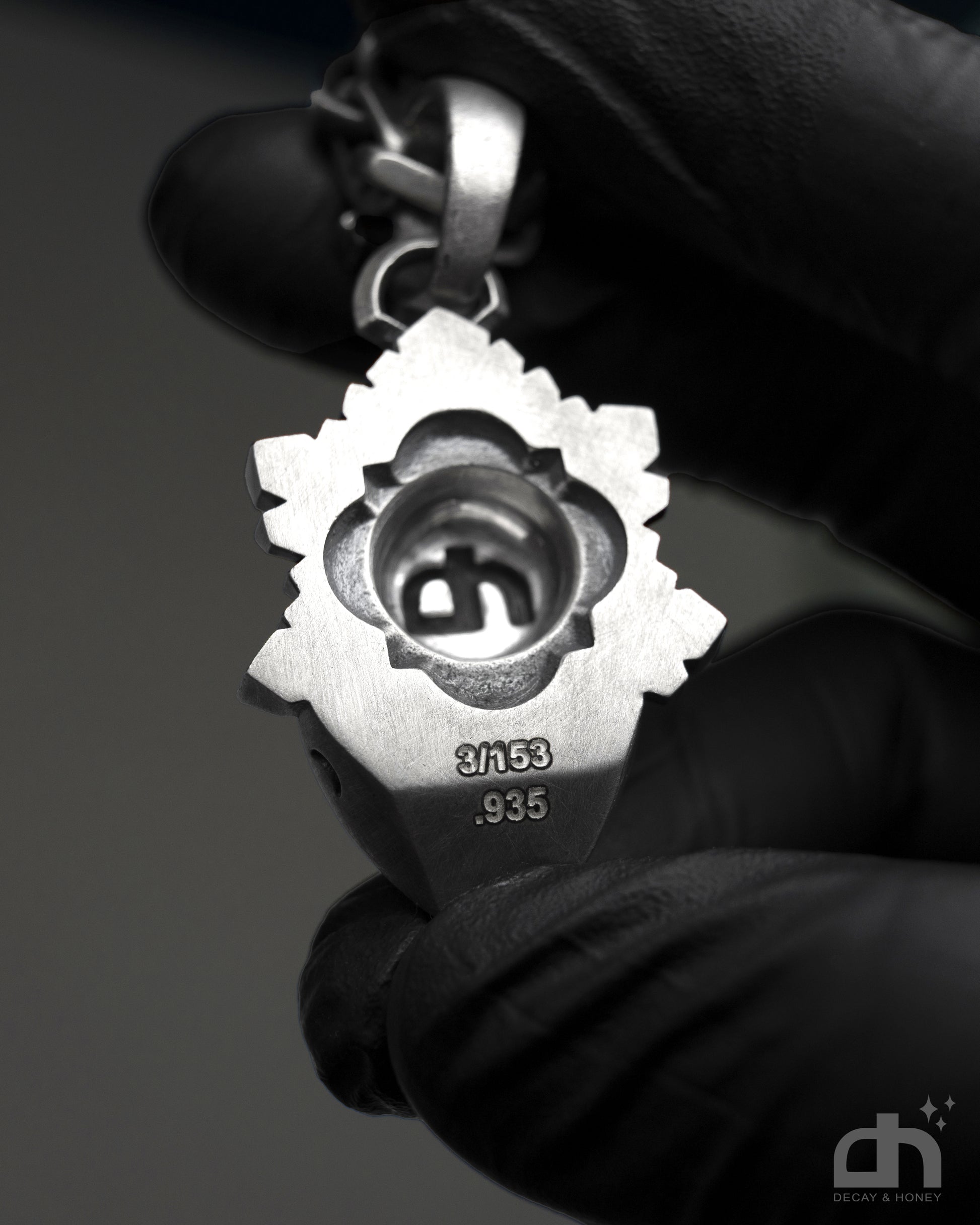 Crafted in 935 sterling silver with deep patinas and cold-polished highlights, every shadow is intentional, contrasting devotion with defiance.
